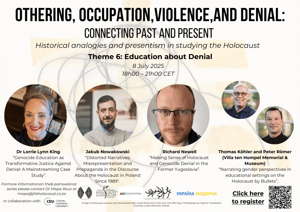 This sixth and final webinar in the series deals with the theme of Education about Denial featuring speakers: Dr Lorrie Lynn King on “Genocide Education as Transformative Justice Against Denial: A Mainstreaming Case Study”, Jakub Nowakowski on “Distorted Narratives: Misrepresentation and Propaganda in the Discourse About the Holocaust in Poland Since 1989″, Richard Newell on “Making Sense of Holocaust and Genocide Denial in the Former Yugoslavia”, and Thomas Köhler and Peter Römer (Villa ten Hompel Memorial & Museum) “Narrating gender perspectives in educational settings on the Holocaust by Bullets”.