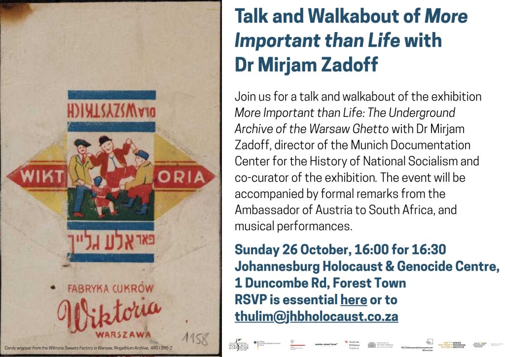 Join us for a talk and walkabout of the exhibition More Important than Life: The Underground Archive of the Warsaw Ghetto with Dr Mirjam Zadoff, director of the Munich Documentation Center for the History of National Socialism and co-curator of the exhibition. The event will be accompanied by formal remarks from the Ambassador of Austria to South Africa, and musical performances.